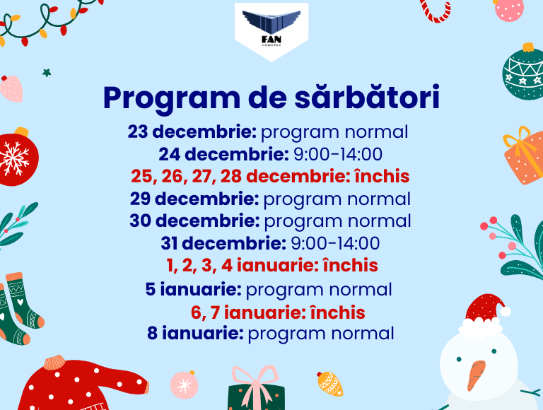 Înainte de Crăciun, ultimele colete le vom expedia pe 23 decembrie. Dintre acestea, unele vor ajunge la dvs. pe 24 dec. sau între 29-31 dec. Ținând cont de volumul mare de comenzi procesate de FANCourier în această perioadă, e posibil ca unele colete să ajungă începând cu 5 ianuarie.